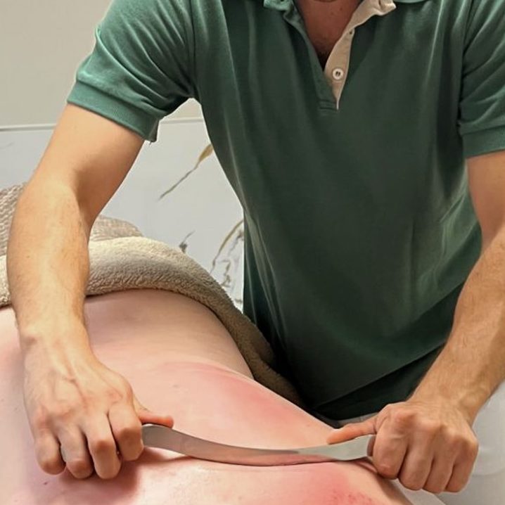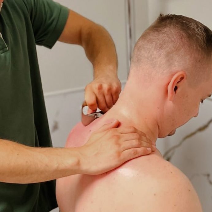 Traditionelle Methode, bei der die Haut mit einem Schaber gestrichen wird. Sie fördert die Durchblutung, löst Blockaden und entspannt Muskeln und Faszien.